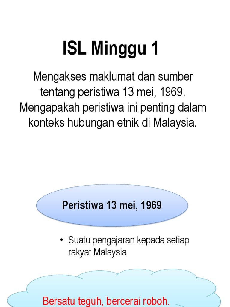 Perbalahan antara kaum berlaku selepas 12 tahun negara merdeka. Tragedi ini mengakibatkan kehilangan nyawa dan harta benda dan mempunyai kaitan yang rapat dengan pilihan raya 1969 dan merupakan satu titik hitam dalam sejarah negara. Tarikh 13 mei 1969 tercatat sebagai sejarah hitam hubungan kaum di negara ini. Peristiwa 13 mei memberi peringatan tentang kebenaran peribahasa kalah jadi abu, menang jadi arang kerana konflik itu merugikan semua kaum, selain menjejaskan imej negara di persada antarabangsa, katanya kepada bernama. Peristiwa 13 mei 1969 merupakan satu tragedi berdarah yang banyak meninggalkan kesan. Kita sebagai warganegara yang bakal mewarisi negara kita bertanggungjawab untuk memelihara perpaduan bangsa. Peristiwa 13 mei 1969 merupakan satu tragedi rusuhan antara kaum yang tercetus 46 tahun yang lalu. Walaupun kita cuba untuk memadamkan peristiwa pahit itu daripda memori namun begitu, pada hakikatnya tregedi itu telah menimbulkan persoalan tentang sejauh manakah perpaduan di kalangan. Peristiwa 13 mei 1969 tanggal 13 mei 1969 tercetus satu detik hitam dalam lipatan sejarah negara. Those who cannot remember the past are condemned to repeat it. Sukma memainkan peranan mengerat perpaduan kaum dan hubungan antara negeri. Kami berharap agar anda semua. Download ppt kesan daripada peristiwa 13 mei 1969.