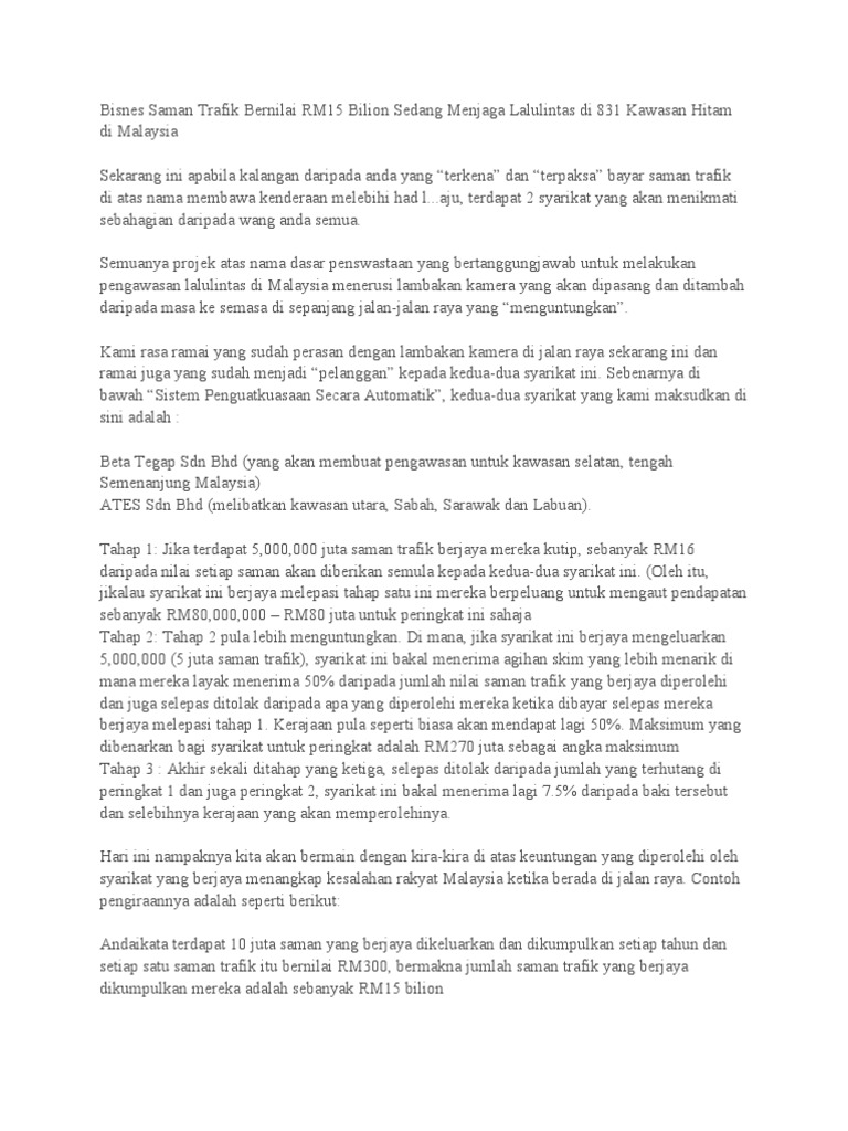 The remaining revenue will be shared with the government up to a cap of rm270 million each, according to a report. Beta tegap sdn bhd, allegedly linked to mca, and ates sdn bhd which installed traffic observation cameras to nab traffic offenders on the southern and northern sides, are entitled to rm16 per summonse for the first five million issued. Irat is in the midst of acquiring ates sdn bhd and beta tegap sdn bhd, which are joint operators of the aes. Redflex aes used by beta tegap sdn bhd. 2 visitors have checked in at beta tegap sdn bhd.